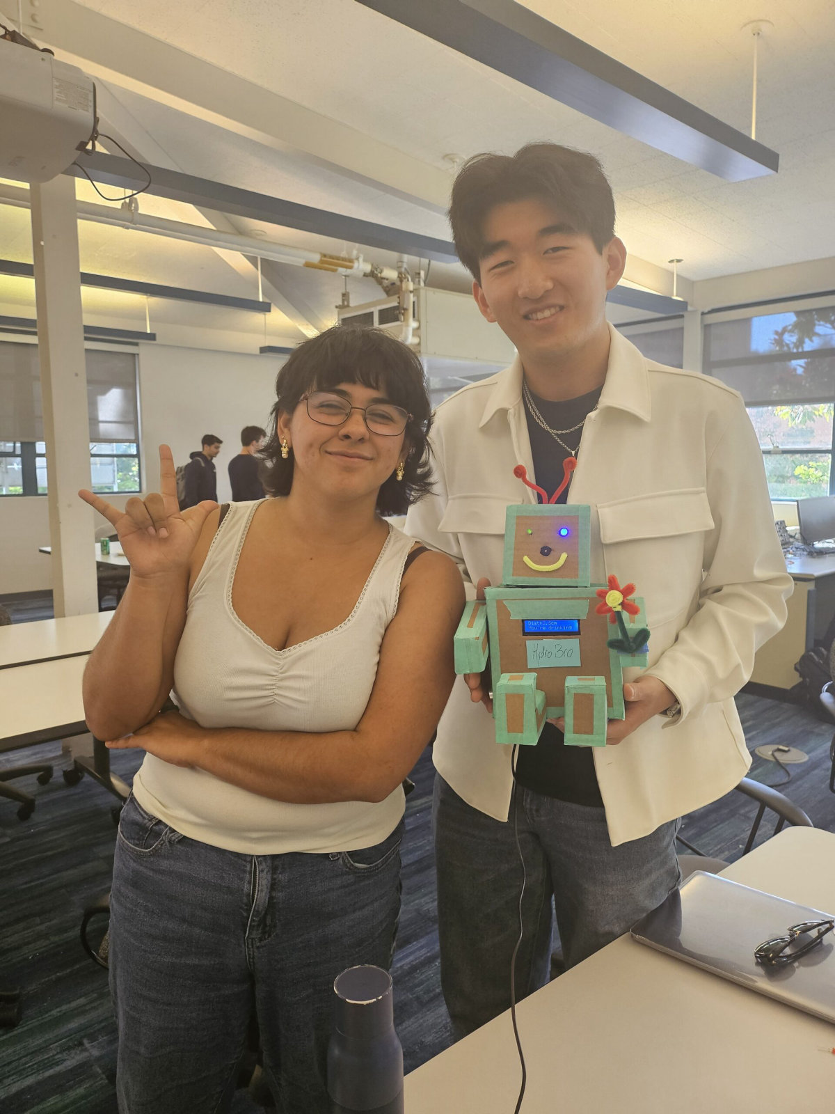 The champion of the hackathon was team H2Optimize and their clever hydration-monitoring robot. This project used a Spresense camera and AI to track water bottle activity. If the robot sensed a prolonged period of stillness, it would gently nudge the user towards better hydration habits with subtle audio alerts and blinking LEDs. H2Optimize impressed the judges with its practical use case, creative integration of Spresense's features, and engaging way it interacted with users. Kudos to Carlie and Jason for bringing an innovative idea to life!